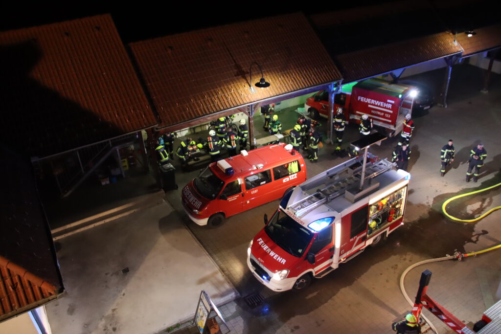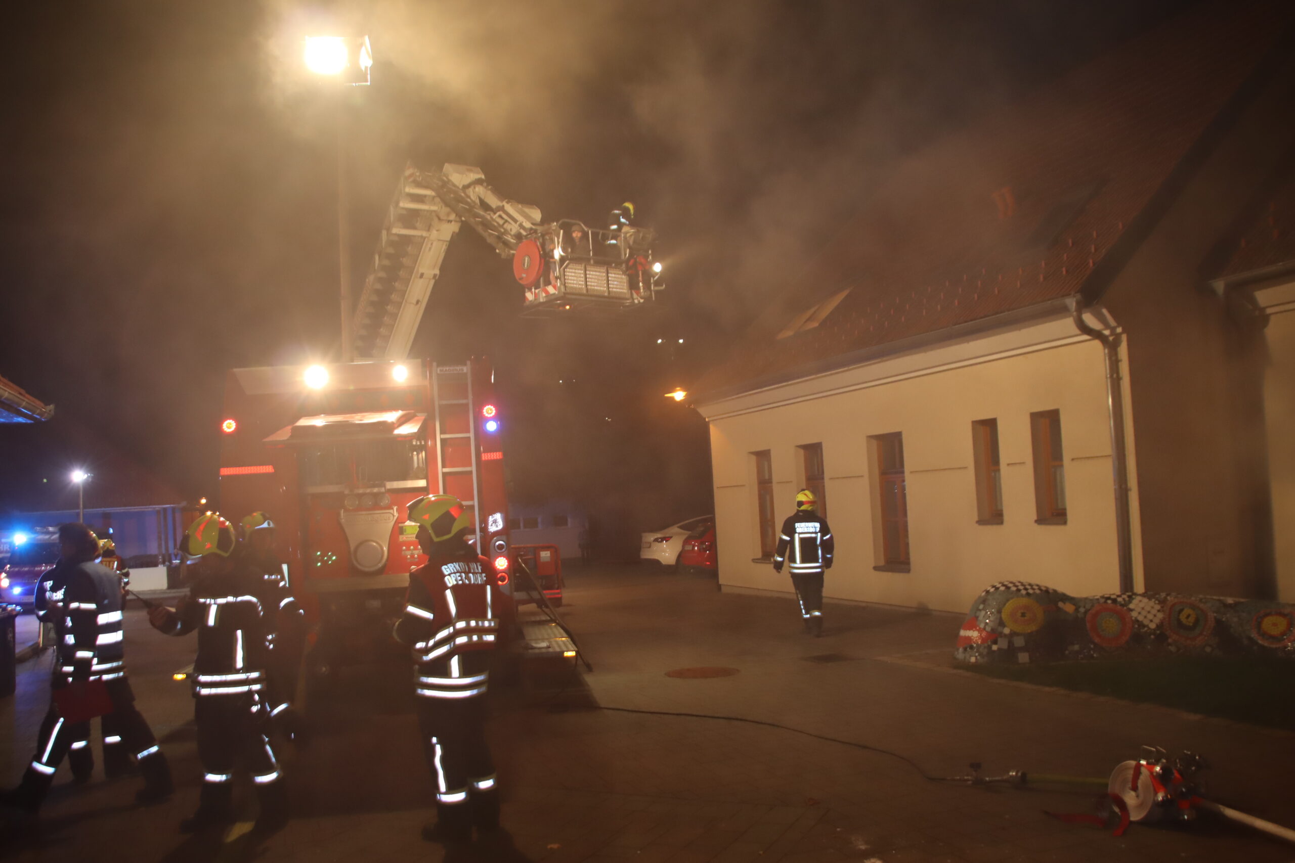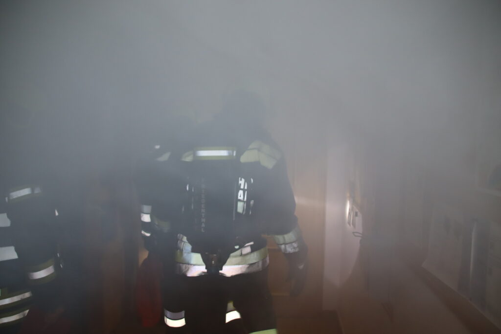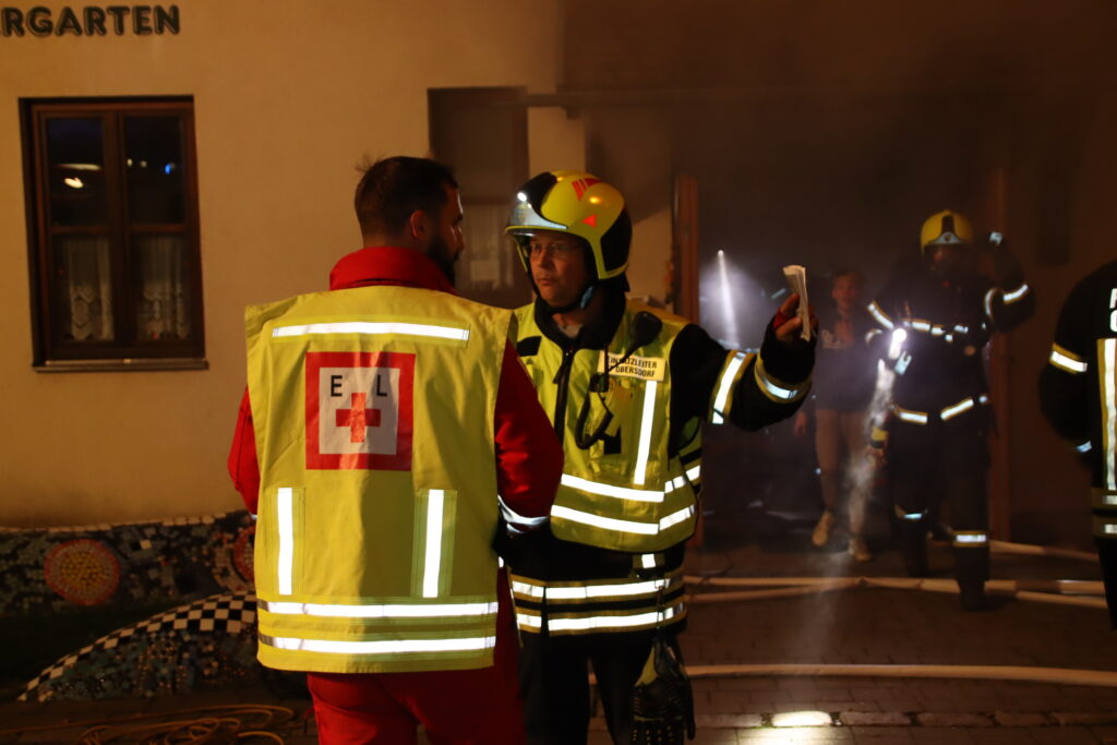 Wir stellten einen Atemschutztrupp für die Personensuche und Menschenrettung im verrauchten Gebäude ab, bauten eine Wasserversorgung von der Obersdorfer Hauptstraße aus auf und unsere Teleskopmastbühne rettete einige eingeschlossene Personen aus dem Obergeschoß. Außerdem unterstützten wir das Rote Kreuz bei der Betreuung der Verletzten. Nach einer knappen Stunde waren alle Einsatzziele erreicht und die Übung endete mit einer detaillierten Nachbesprechung vor Ort.