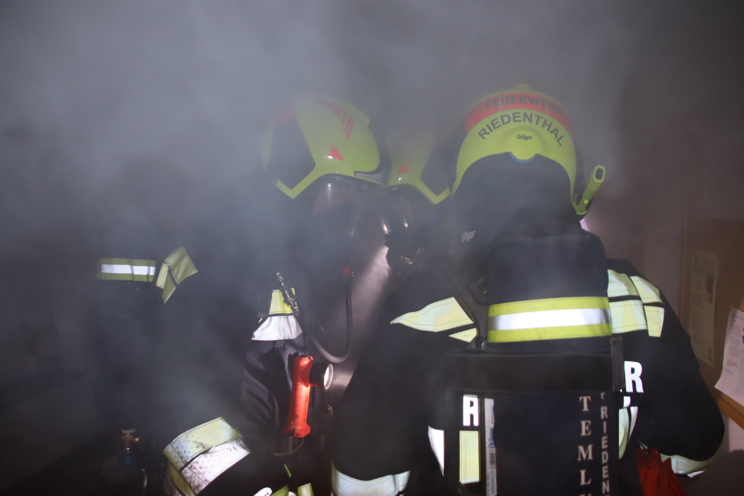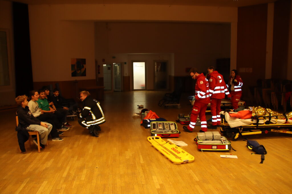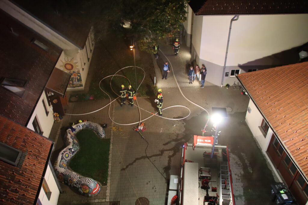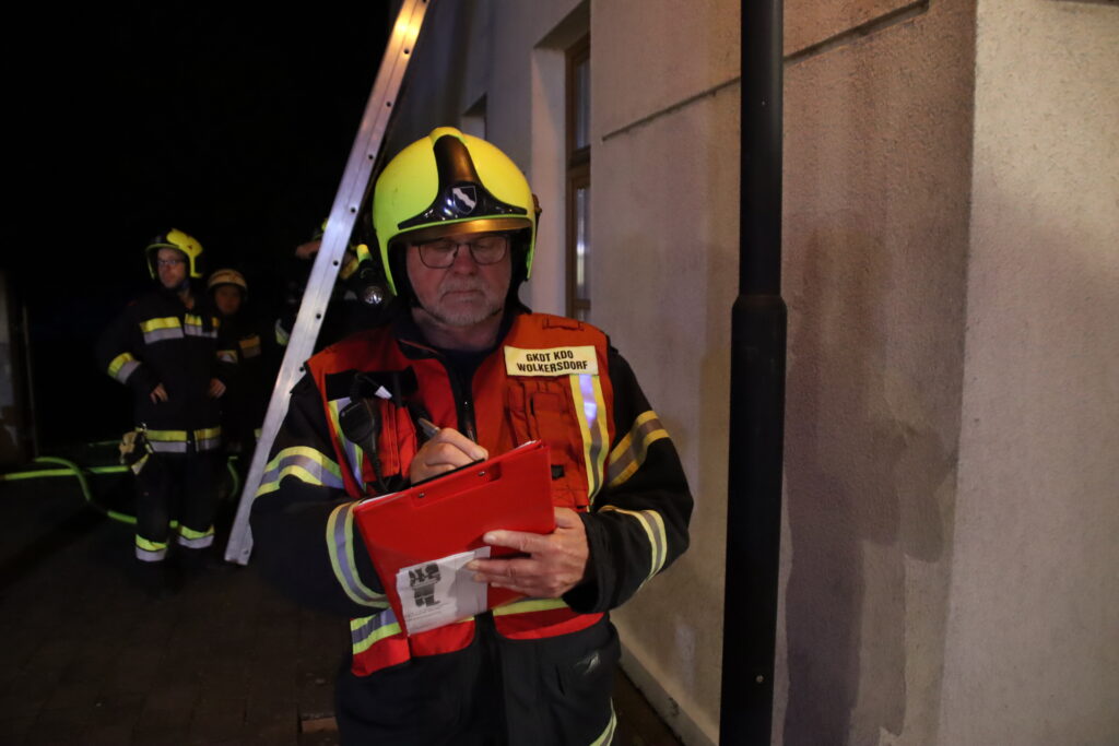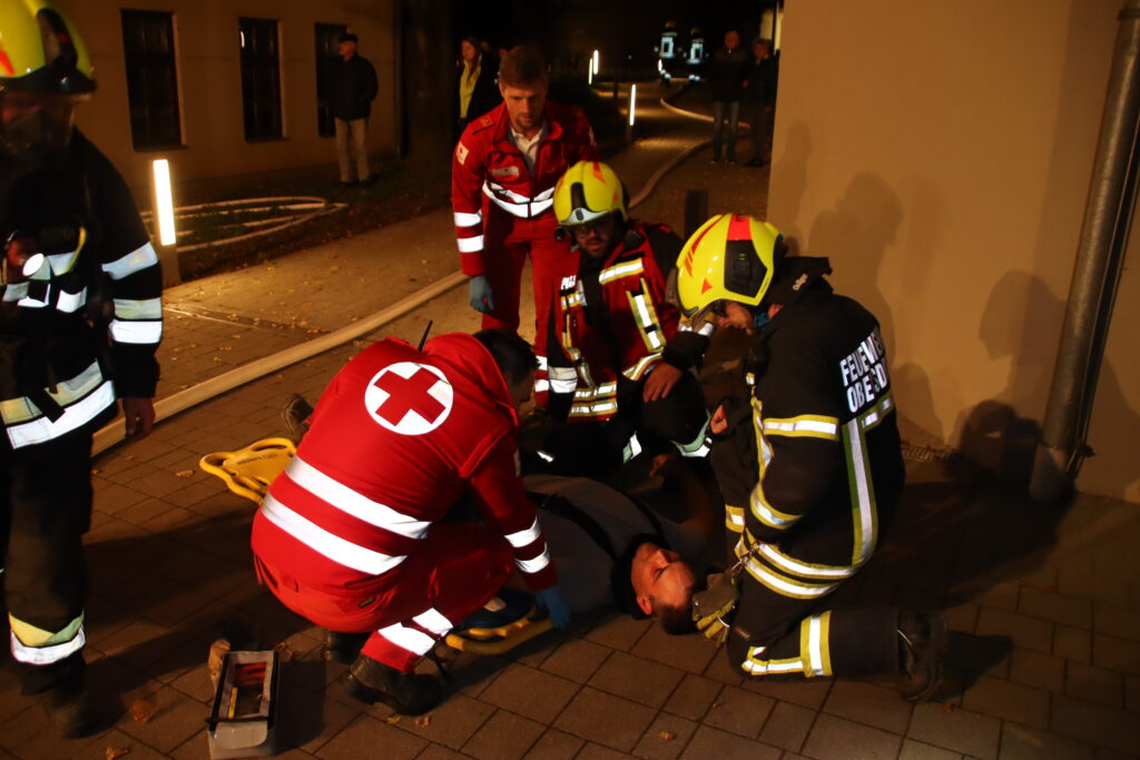 Wir stellten einen Atemschutztrupp für die Personensuche und Menschenrettung im verrauchten Gebäude ab, bauten eine Wasserversorgung von der Obersdorfer Hauptstraße aus auf und unsere Teleskopmastbühne rettete einige eingeschlossene Personen aus dem Obergeschoß. Außerdem unterstützten wir das Rote Kreuz bei der Betreuung der Verletzten. Nach einer knappen Stunde waren alle Einsatzziele erreicht und die Übung endete mit einer detaillierten Nachbesprechung vor Ort.