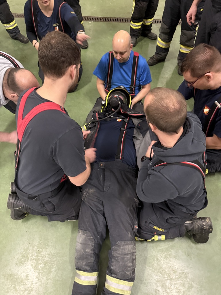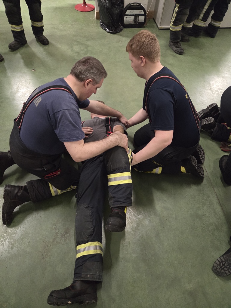 Bei der zweiten Station „verunfallte“ ein Atemschutzgeräte-Träger. Hier wurden folgende Themen besprochen und beübt: den Geräteträger aus dem Gefahrenbereich bringen, ihn von der Einsatzbekleidung befreien und den Notfallcheck durchführen.