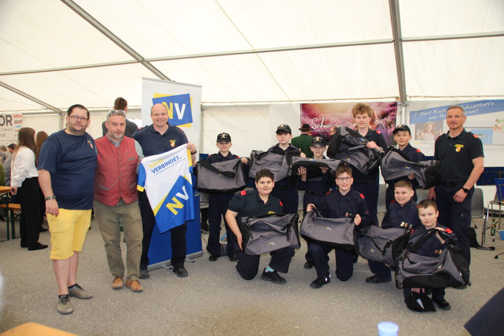 Andreas Ammerer von der NÖ Versicherung sponserte 30 Sporttaschen und 30 Funktions-T-Shirts für die Feuerwehrjugend Wolkersdorf und die Betreuer:innen, Stadtrat Herbert Wolf die Namensschilder dafür.