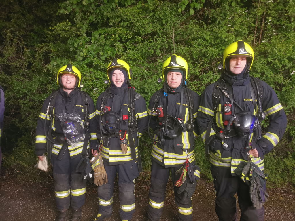 Bei unserer Ankunft sind die Löschangriffe bereits im Gange, wir unterstützen mit Schlauchmaterial und stellen Atemschutz-Geräteträger für die Löscharbeiten.