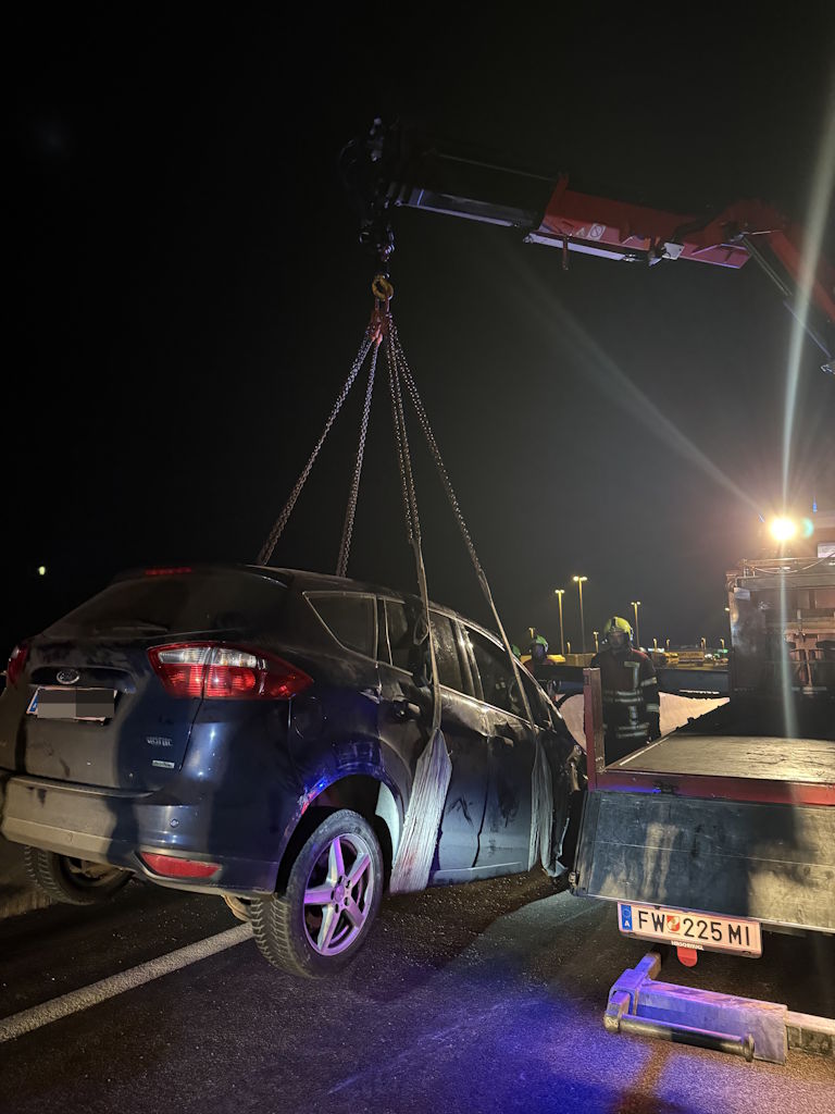 Nach einem Verkehrsunfall steht auf der Richtungsfahrbahn Wien gegenüber der Raststation ein schwer beschädigtes Fahrzeug auf der Überholspur. Gemeinsam mit der Feuerwehr Hochleithen nehmen wir die Bergung des PKW mit Hebegurten und dem Kran vor. Im Anschluß wird das Fahrzeug bei der Autobahnmeisterei gesichert abgestellt.