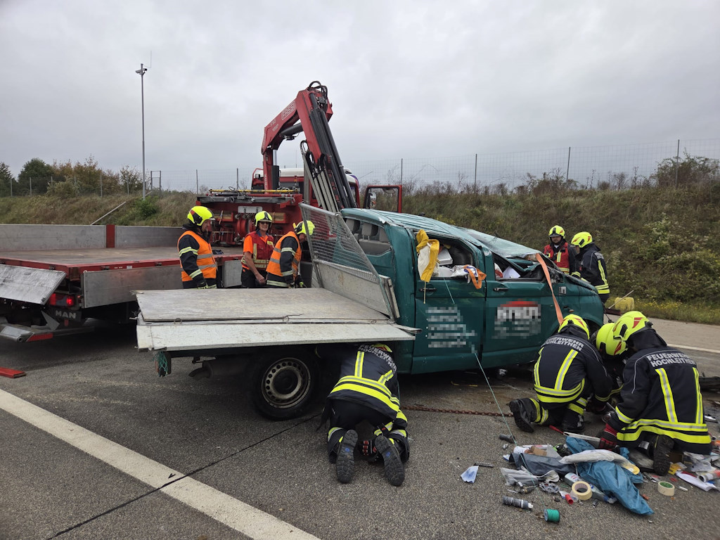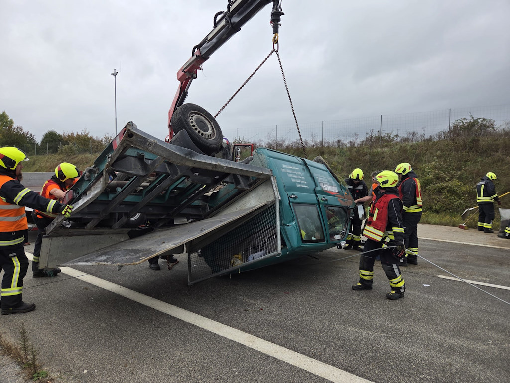 Gemeinsam mit der FF Hochleithen galt es nun, das Unfallfahrzeug, welches am Dach quer über die Fahrbahn lag, zu entfernen und die Verkehrswege freizumachen. Das Fahrzeug wurde mit dem Kran auf die Räder gestellt und in weiterer Folge auf die Hubbrille verladen. Die Sicherstellung erfolgte wie in solchen Fällen üblich bei der Autobahnmeisterei.