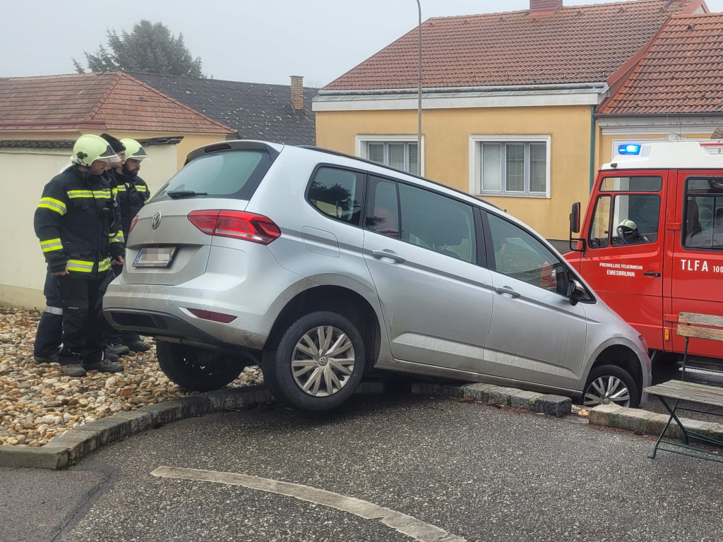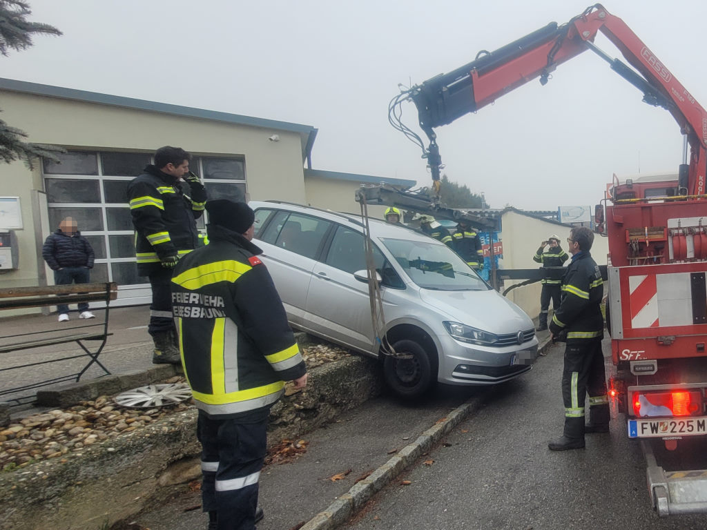 Die Kranschleife der FF Wolkersdorf wurde um 13:16 Uhr zur Bergung eines PKW nach Eibesbrunn alarmiert. An der dortigen Tankstelle war ein PKW über den Randstein „gehüpft“ und hing – mit der Vorderachse und einem Hinterrad in der Luft – auf der Einfriedungsmauer fest.