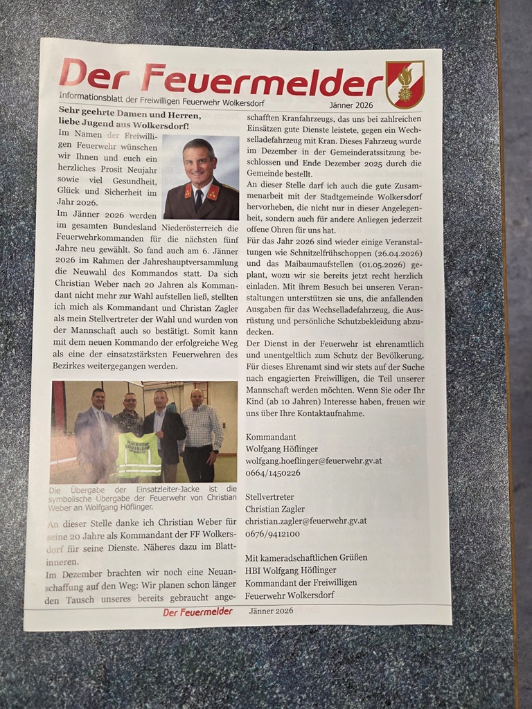 Erstellung des zwei Mal jährlich an alle Haushalte Wolkersdorfs verschickten Informationsblatts „Feuermelder“